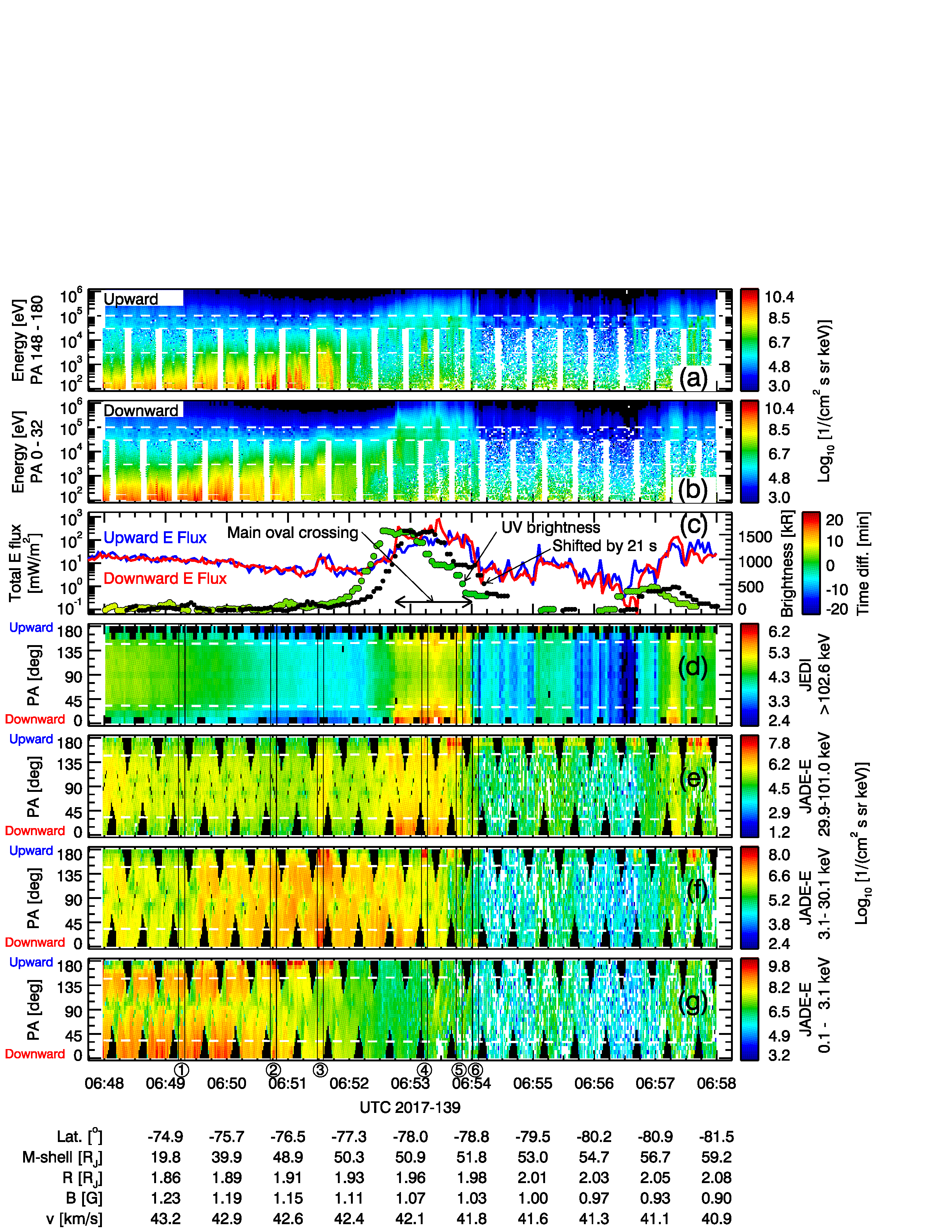 Combined JADE and JEDI electron distributions and UV brightness during the main auroral oval crossing in the south from perijove 6. Panels (a) and (b) show the electron intensities as a function of time for upward electrons (going away from Jupiter) and downward electrons (going toward Jupiter), respectively. Panel (c) shows the total energy flux within the loss cone of upward and downward electrons, as well as the UV brightness mapped to 400 km altitude using the JRM09 magnetic field model. A 21-s shift of the brightness data lines up very well with the downward energy flux data. We estimate that the main oval crossing happens roughly between 06:52:45 and 06:54:00, which corresponds to the bright white arc in Fig. 2 (a). Panels (d) through (g) show the pitch angle distributions for the energy ranges indicated on the right. The jovigraphic latitude (Lat.), the M-shell (JRM09+CAN1981), the jovicentric distance (R), the measured magnetic field strength (B), and the spacecraft speed (v) are indicated at the minute markers at the bottom of the figure. The vertical lines in panels (d) through (g) and the circled numbers below panel (g) indicate time intervals for energy spectra and pitch angle distributions described further.